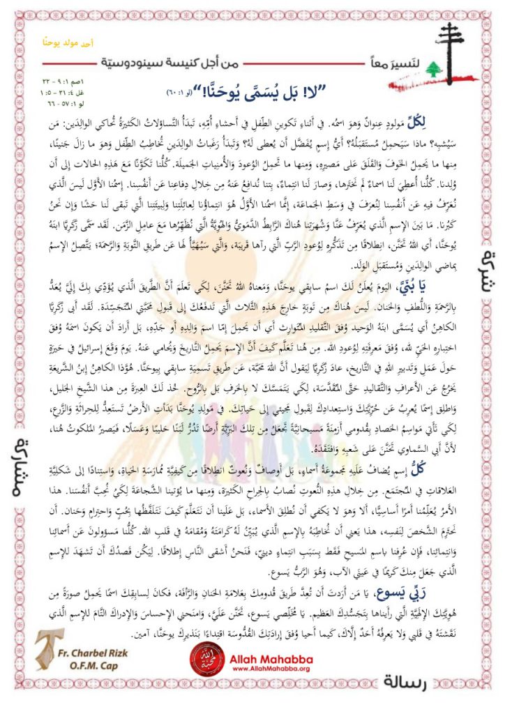 لِكُلِّ مَولودٍ عِنوانٌ وَهوَ اسمُه. في أَثناءِ تَكوينِ الطِّفلِ في أَحشاءِ أُمِّهِ، تَبدَأُ التَّساؤلاتُ الكَثيرَةُ تُحاكي الوالِدَين: مَن سَيُشبِه؟ ماذا سَيَحمِلُ مُستَقبَلُهُ؟ أَيُّ إِسمٍ يُفَضَّل أَن يُعطى لَهُ؟ وَتَبدَأُ رَغَباتُ الوالِدَينِ تُخاطِبُ الطِّفل وَهوَ ما زالَ جَنينًا، مِنها ما يَحمِلُ الخَوفَ وَالقَلَقَ عَلى مَصيرِهِ، وَمِنها ما تَحمِلُ الوُعودَ وَالأُمنِياتِ الجَميلَة. كُلُّنا تَكَوَّنّا مَعَ هَذِهِ الحالات إِلى أَن وُلِدنا. كُلُّنا أُعطِيَ لَنا اسماءٌ لَم نَختَرها، وَصارَ لَنا انتِماءٌ، بِتنا نُدافِعُ عَنهُ مِن خِلالِ دِفاعِنا عَن أَنفُسِنا. إِسمُنا الأَوَّل لَيسَ الَّذي نُعَرِّفُ فيهِ عَن أَنفُسِنا لِنُعرَفَ في وَسَطِ الجَماعَة، إِنَّما اسمُنا الأَوَّلُ هُوَ انتِماؤُنا لِعائِلَتِنا وَلِبيئَتِنا الَّتي تَبقى لَنا حَشًا وَإِن نَحنُ كَبُرنا. مَا بَينَ الإِسم ِالَّذي يُعَرِّفُ عَنَّا وَشُهرَتِنا هُناكَ الرَّابِطُ الدَّمَويُّ وَالهُوِيَّةُ الَّتي نُظَهِّرُها مَعَ عامِلِ الزَّمَن. لَقَد سَمَّى زَكَرِيَّا ابنَهُ يُوحَنَّا، أَي اللهُ تَحَنَّن، انِطلاقًا مِن تَذَكُّرِهِ لِوُعودِ الرَّبِّ الَّتي رآها قَريبَة، وَالَّتي سَيُهَيَّأُ لَها عَن طَريقِ التَّوبَةِ وَالرَّحمَة؛ يَتَّصِلُ الإِسمُ بِماضي الوالِدَينِ وَمُستَقبَلِ الوَلَد.