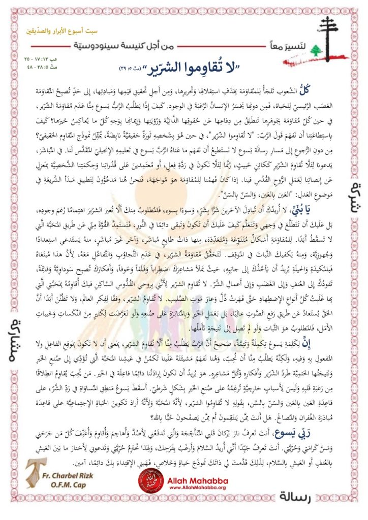 إِنَّ لِكَلِمَةِ يَسوعَ تِكمِلَةٌ وَتَتِمَّةٌ، صَحيحٌ أَنَّ الرَّبَّ يَطلُبُ مِنَّا أَلَّا نُقاوِمَ الشرّير، بِمَعنى أَن لا نَكونَ بِمَوقِعِ الفاعِلِ ولا المـَفعولِ بِهِ وَفيهِ، وَلَكِنَّهُ يَطلُبُ مِنَّا أَن نُحِبّ، وَهُنا نَفهَمُ مَشيئَتَهُ عَلَينا تَكمُنُ في عَيشِنا المـَحَبَّة الَّتي تُؤَدِّي إِلى صُنعِ الخَيرِ وَنَتيجَتُها الحَتمِيَّة طَردُ الشّرّير وَأَفكارِهِ وَكُلَّ مَشاعِرِهِ. هوَ يُريدُ أَن تَكونَ إِرادَتُنا دائِمًا فاعِلَة في الخَير. مَن يُحِبّ يُقاوِمُ انطِلاقًا مِن رَغبَةِ قَلبِهِ وَلَيسَ لِأَسبابٍ خارِجِيَّةٍ تُرغِمُهُ على صُنعِ الخَيرِ بِشَكلٍ شَرطيّ. أَسقَطَ يَسوعُ مَنطِقِ المـُساوَاةِ في رَدِّ الشَّرّ، على قاعِدَةِ العَين بِالعَين وَالسّنّ بِالسَّن، بِقَولِهِ لا تُقاوِمُوا الشرّير، لِأَنَّهُ المـَحَبَّة وَلِأَنَّهُ أَرادَ تَكوينَ الحَياةِ الإِجتِماعِيَّة على قاعِدَة مُبادَرَة الغُفران وَالمـُصالَح. هَل أَنتَ مِمَّن يَنتَقِمونَ أَم مِمَّن يَصفَحونَ حُبًّا بِالله؟