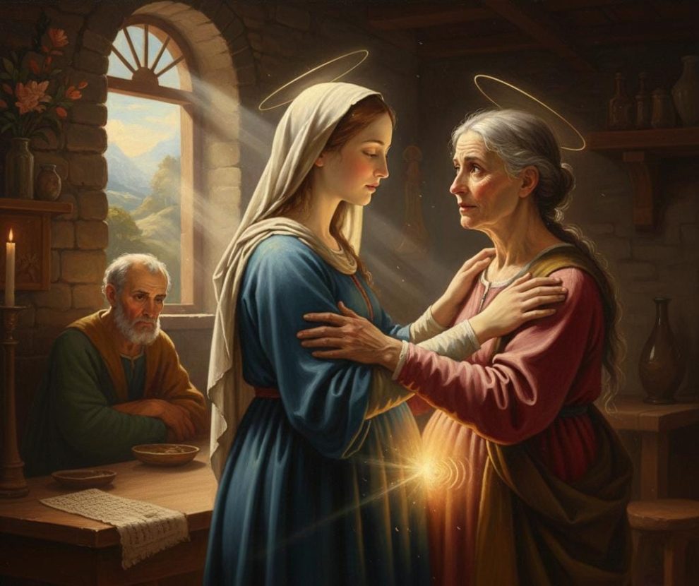 لا يَسْري التّاريخُ بِلا بَوْصَلَةٍ وَلا هَدَفٍ، فَهُوَ لَيْسَ بِلا قِيادَةٍ وَلا مَعْنًى، بَلْ على العَكْسِ مِنْ ذلِكَ تَمامًا: فَالكَلِمَةُ الَّذي بِهِ كانَ كُلُّ شَيْءٍ، وَبِدونِهِ ما كانَ شَيْءٌ مِمَّا كانَ، باتَ هُنا وَالآنَ حَيًّا وَحاضِرًا وَفاعِلًا، يَقودُ العالَمَ إِلى الخَلاصِ وَفْقًا لِتَدبيرِهِ الأَزَلِيِّ. لَقَدْ سَقَطَتْ لَعْنَةُ حَوّاءَ إِلى الأَبَدِ، لِأَنَّ مَريَمَ المُبارَكَةَ بَيْنَ النِّساءِ أَعادَتِ الكَرامَةَ لِكُلِّ الجِنْسِ البَشَرِيِّ. لَقَدْ أُزيلَ طَعْمُ ثَمَرَةِ الخَطيئَةِ وَالمَوْتِ الَّتي تَناوَلَها آدَمُ وَحَوّاءُ، لِأَنَّ ثَمَرَةَ أَحْشاءِ مَريَمَ هِيَ الحَياةُ الأَبَدِيَّةُ في ذاتِهِ، فَكُلُّ مَنْ يَأْكُلُ مِنْهُ لا يَعْرِفُ المَوْتَ أَبَدًا. هكَذا أَصْبَحَ ارْتِكاضُ الجَنينِ في أَحْشاءِ أَليصاباتَ أَوَّلَ عَلامَةٍ عَمَّا سَيَحْدُثُ في العالَمِ كُلِّهِ. لَقَدِ اخْتَرَقَ اللهُ عالَمَنا وَتاريخَنا وَإِنْسانِيَّتَنا، وَأَصْبَحَ مَعَ مَريَمَ في مَكانٍ وَزَمانٍ مُحَدَّدَيْنِ، وَبَعْدَها سَيَشْمَلُ العالَمَ بِأَسْرِهِ.