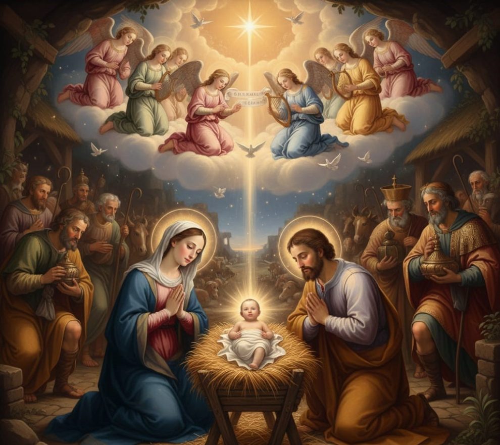 لَقَدْ وُلِدَ يَسوعُ في بَيتِ لَحمَ، وَلَمْ يُوجَدْ لَهُ مَكانٌ في المَضافَةِ، بَلْ وُضِعَ في مِذوَدٍ، وَلُفَّ بِالأَقمِطَةِ. وَلِأَنَّهُ عِمَّانوئيلُ — اللهُ المَحَبَّةُ مَعَنا — فَفيهِ وَبِهِ وَمَعَهُ عَرَفَتِ الأَرضُ مَجدَ السَّماءِ، وَبَلَغَ سَلامُهُ أَقصى الأَرضِ، وَأَصبَحَ رَجاؤُهُ حَياةً أَبَدِيَّةً، وَنَحنُ أَصبَحْنا بِميلادِهِ أَبناءً، فيهِ وَمَعَهُ، للهِ الآبِ، بِقُوَّةِ الرُّوحِ القُدُسِ. آمين.