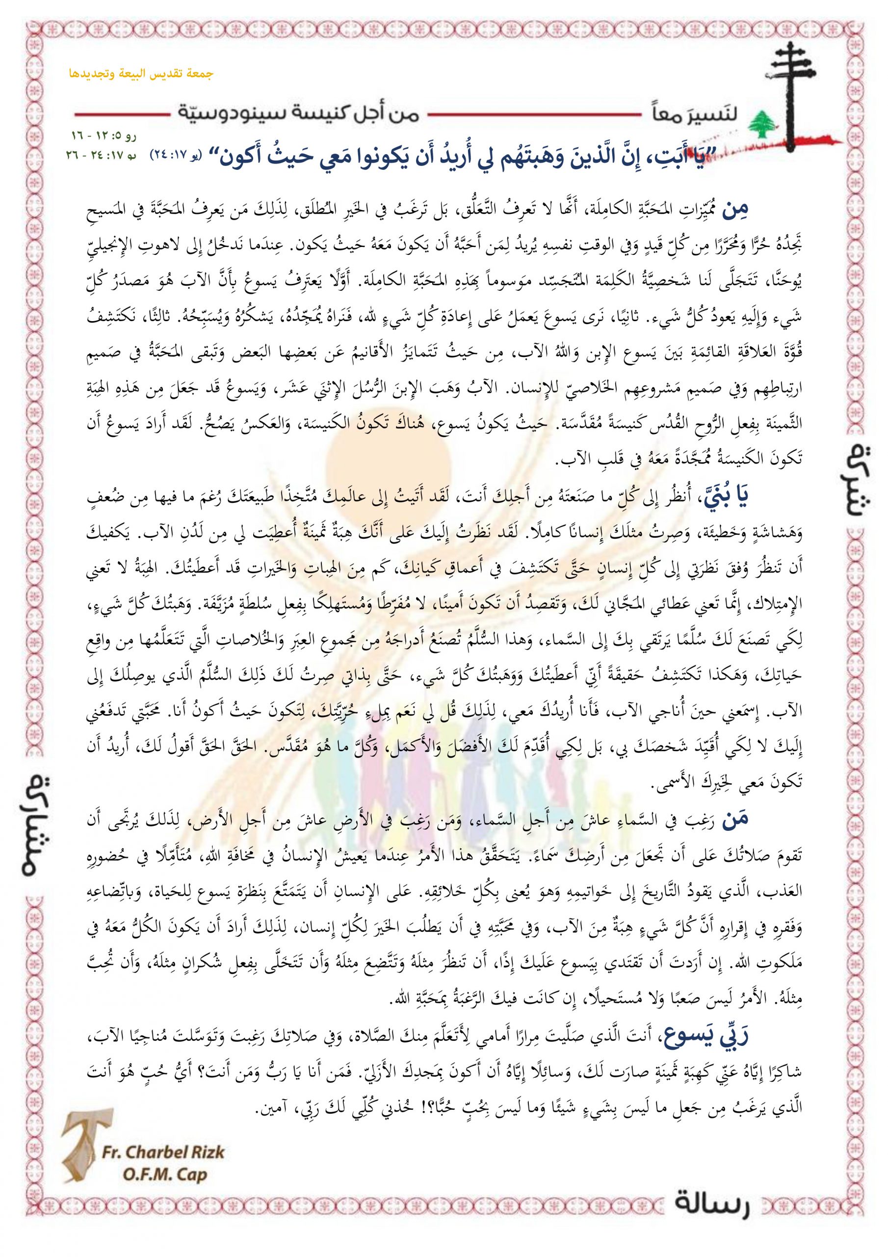 شكراً لزيارة موقعنا وقراءة تأمّل جمعة تقديس البيعة وتجديدها “يَا أَبَتِ، إِنَّ الَّذينَ وَهَبتَهُم لي أُريدُ أَن يَكونوا مَعي حَيثُ أَكون”. ندعوك لمشاركة هذا التأمّل مع أصدقائك ومتابعتنا على مواقع التواصل الإجتماعي على فيسبوك، انستغرام، يوتيوب وتويتر. نسأل الله أن يضع سلامه في قلبك أينما حللت ومهما فعلت، وأن يعطيك نعمة القداسة لكي تكون ملحاً للأرض ونوراً لعالم اليوم!